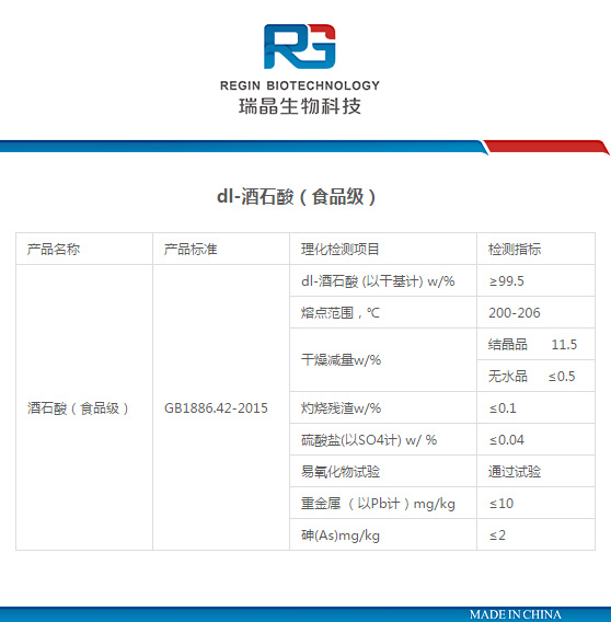 廣泛用于食品、醫(yī)藥、化工、輕工等行業(yè),主要用于制造酒石酸鹽類,如酒石酸銻鉀、酒石酸鉀鈉等。在食品行業(yè)用作啤酒發(fā)泡劑、食品酸味劑、矯味劑等。其酸味為檸檬酸的1.3倍,特別適用作葡萄汁的酸味劑。本品經(jīng)FAO/WHO專家委員會鑒定為優(yōu)良之食品添加劑。它在鞣革、照相、玻璃、搪瓷、電訊器材等工業(yè)也有非常重要的作用。